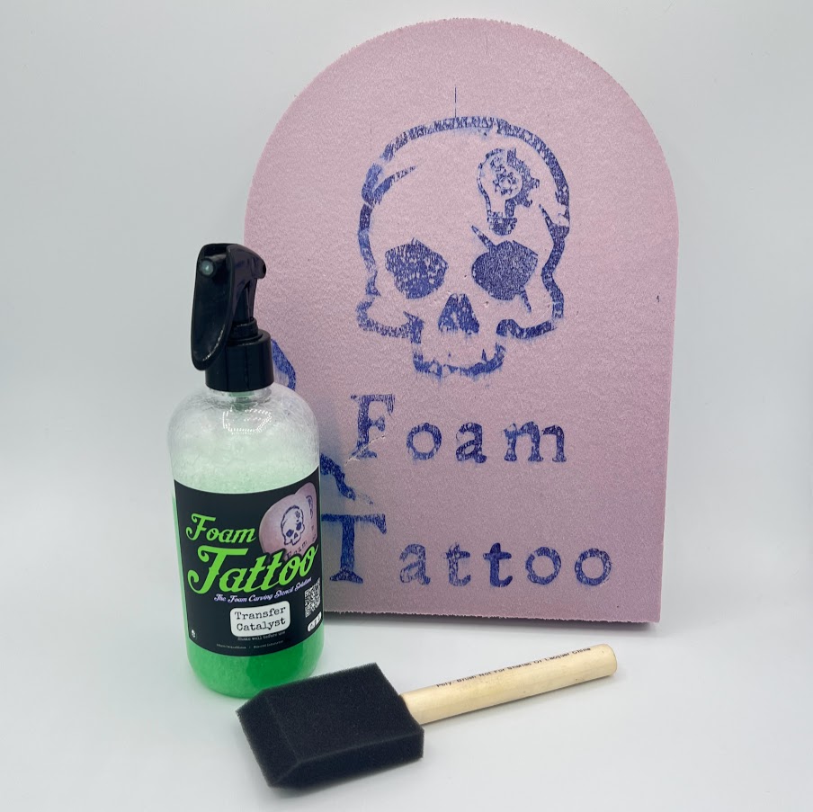 For this process to work you will need a moisture catalyst that distributes the right amount of moisture for the transfer to be clean.  Too much moisture and you will get a mess of ink and no discernable text or image to guide your carving.  The [Maker86 Foam Tattoo Transfer Catalyst](https://maker86.com/shop/ols/products/foam-tattoo-transfer-catalyst) is a specially designed moisture solution to get the best transfer results. This is a proprietary solution developed by MalaMaker.